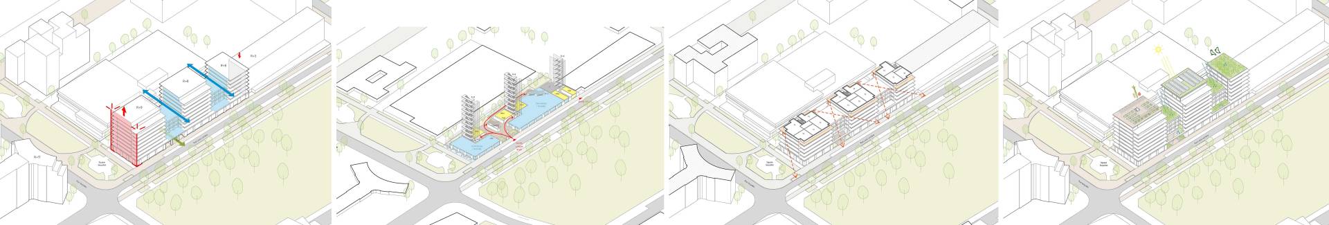 Situé dans la ZAC Python Duvernois, le projet a une position stratégique, amorçant la requalification de ce quartier aujourd’hui enclavé entre le boulevard périphérique et le boulevard Davout. La volumétrie du projet rompt avec les typologies de barres du site avec deux généreuses failles formant trois plots élancés. Ces porosités est-ouest renforcent les liaisons entre les éléments du paysage et offrent aux logements des qualités d’ensoleillement et des vues dégagées. Le principe constructif allie la rationalité et la flexibilité d’une structure poteaux poutres bois et la vertu d’un isolant biosourcé en paille.