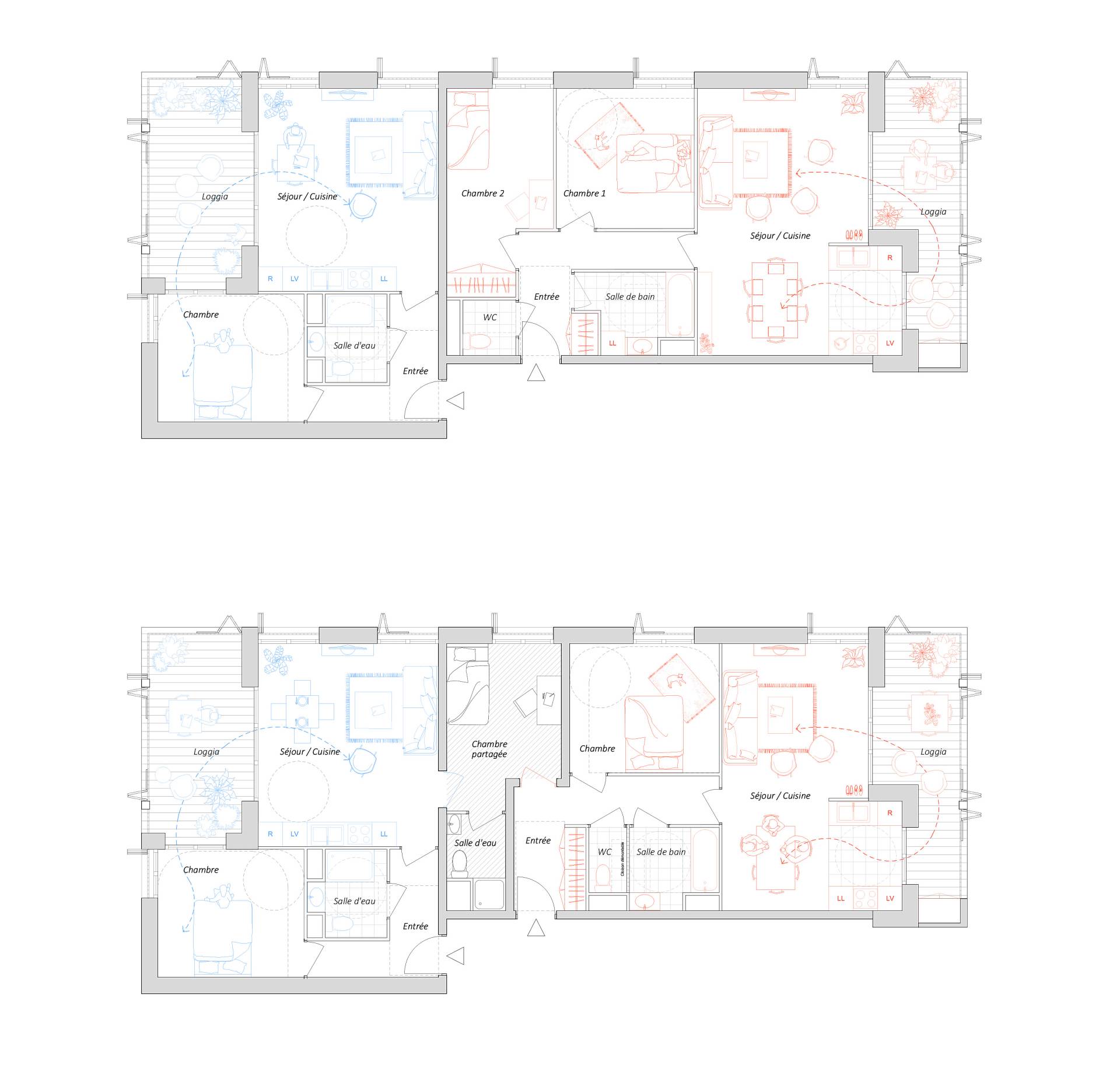 110 logements bois-paille à Paris ZAC Python Duvernois - Plans des typologies évolutives