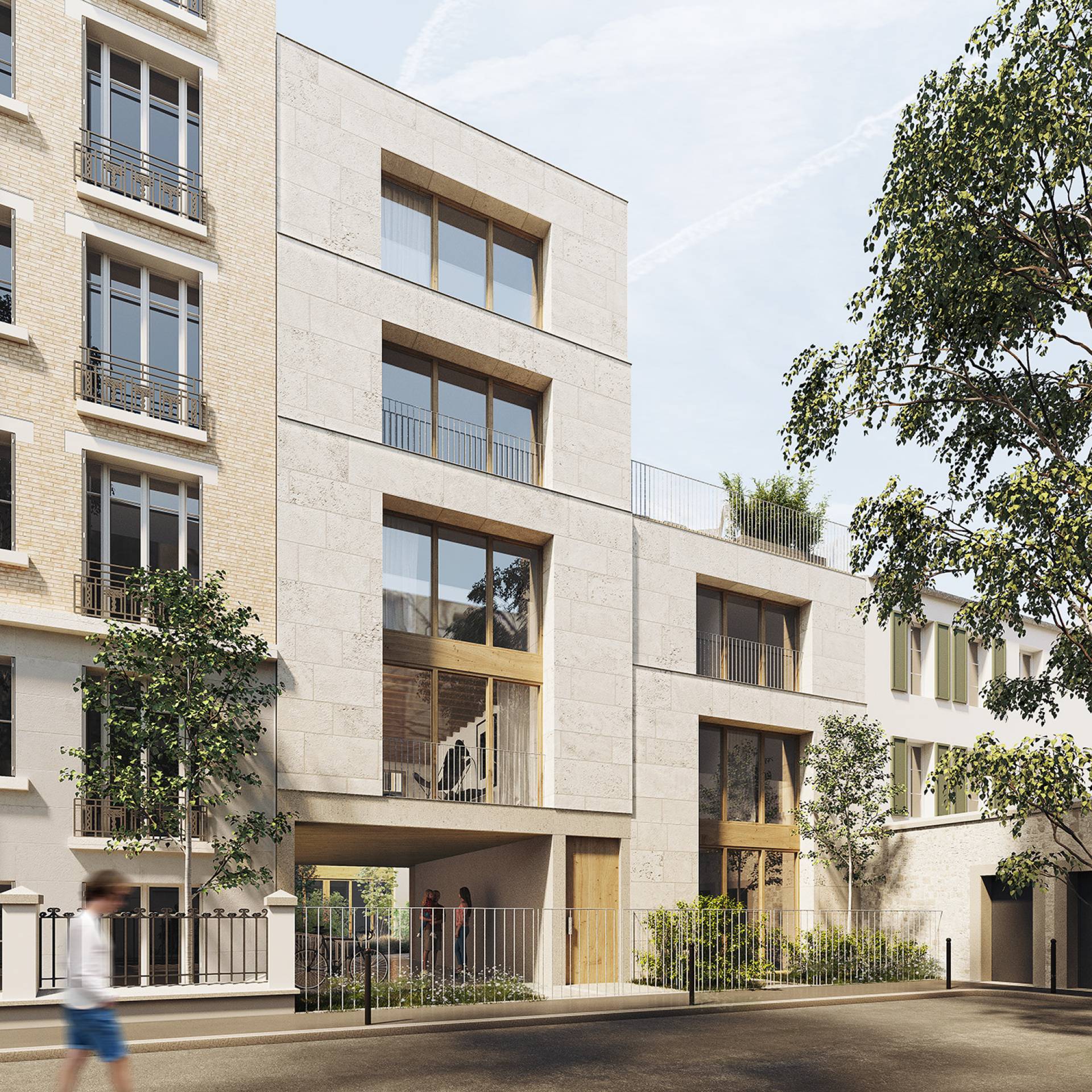 Pour la deuxième intervention, côté impasse, le choix est porté sur la pierre, matériau pérenne, local et réemployable et déjà présent sur les premiers niveaux du bâtiment voisin au sud-est. Issue de carrière francilienne, elle sera employée en structure semi-porteuse en façade et doublée d'un isolant intérieur biosourcé de type laine de chanvre. Cette écriture de pierre met en valeur chacune des maisonnée superposée comme un empilement de blocs directement issus de la carrière, conférant un caractère plus domestique propre à l'impasse.
