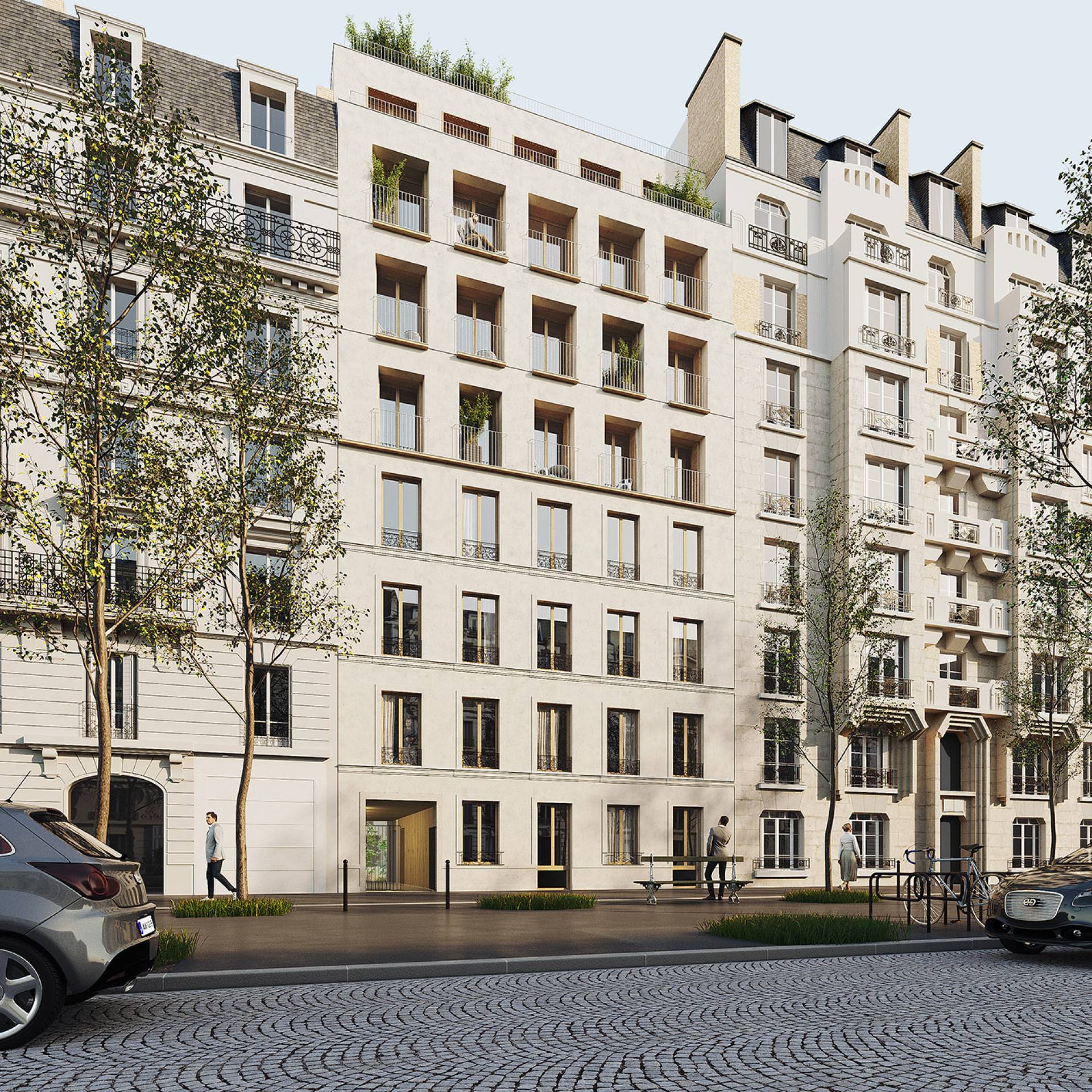 Côté avenue, l’extension respecte l’écriture de l’existant, elle reprend les cinq travées de fenêtres, le dessin de leur assise et encadrement mais en les ancrant dans un discours contemporain : la fenêtre s’agrandit progressivement par étage (plus on s’approche du ciel et qu’on échappe à la visibilité depuis la rue mais aussi plus on a de grands logements sans recoupement contraignant de séparatifs entre fenêtres), son appui est en bois et zinc, son encadrement n’est plus décor mais usage : le cadre sort du plan de la façade, il est travaillé dans la profondeur pour créer une façade épaisse servant de prolongement extérieur. Le fond de ces petites loggias est serti de bois en voussure et volets afin de conférer un aspect précieux à la fenêtre et de mettre en valeur un matériau écologique et vertueux utilisé dans la structure, protégé des intempéries par le renfoncement.