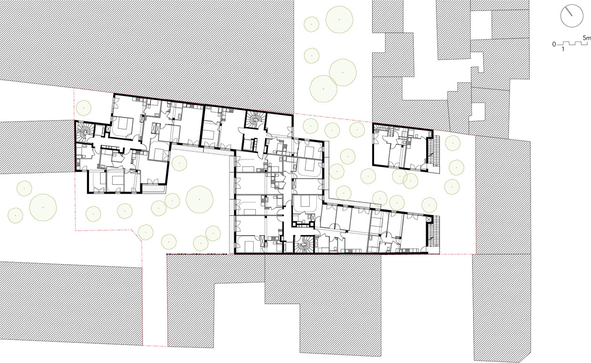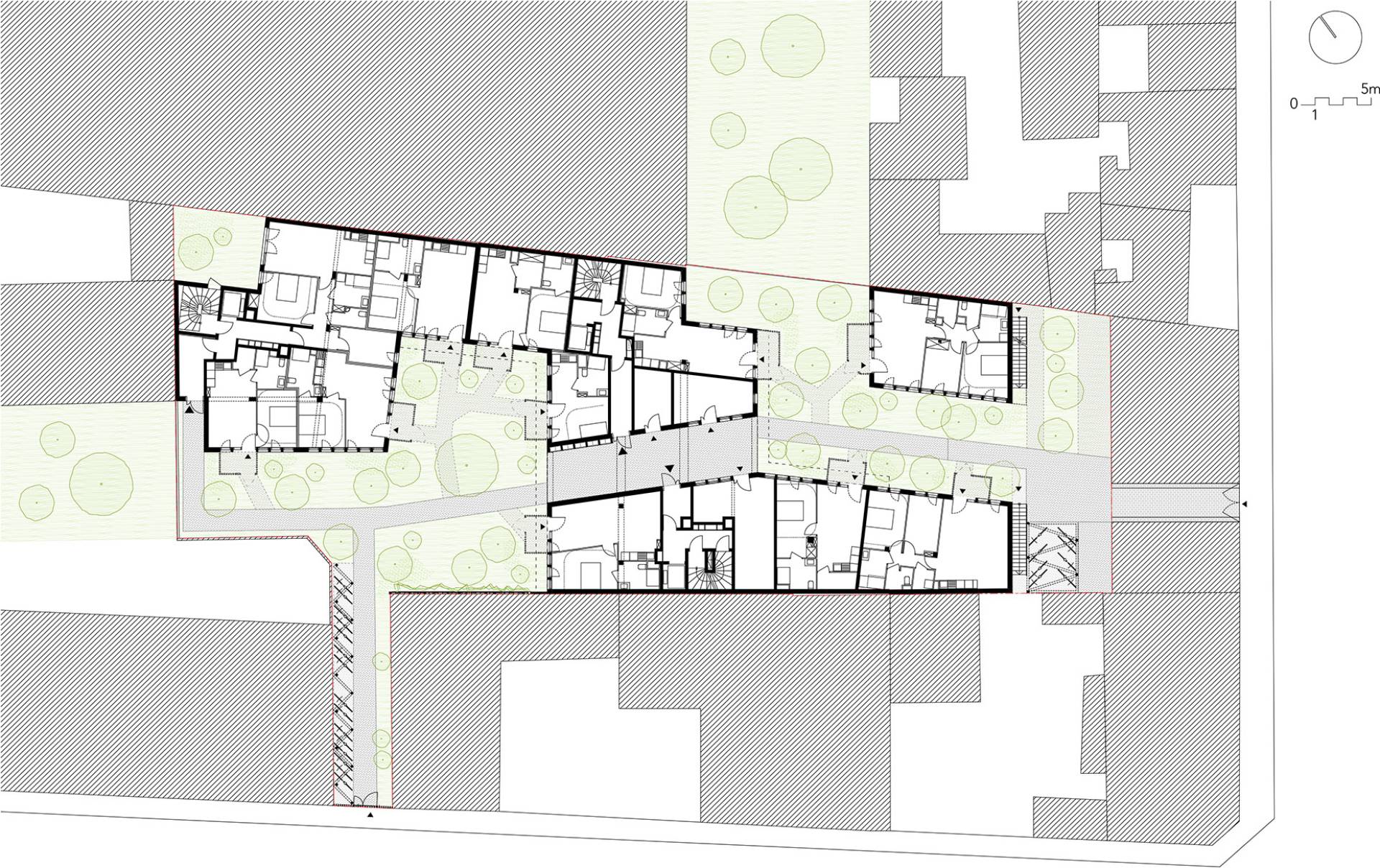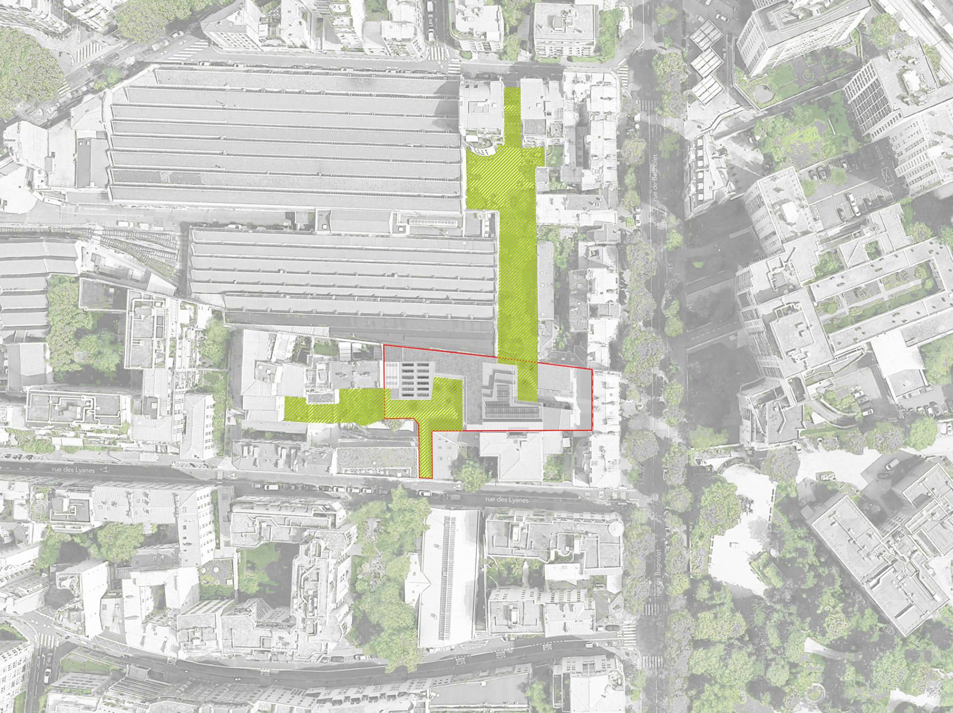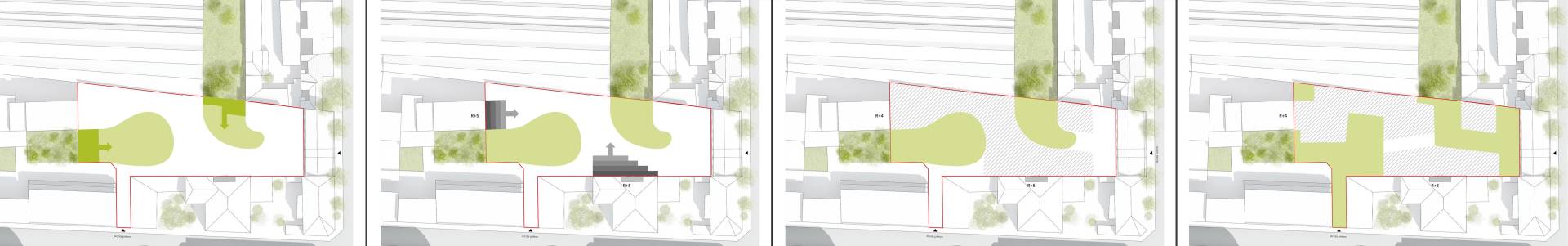 Le passé artisanal de la cour des Lyanes a chargé ce site d’une identité forte encore palpable aujourd'hui. Le projet propose de réinventer ce paysage intérieur, d'en préserver l'imaginaire en le rattachant à la ville de demain : l’implantation du bâti conserve cette traversée tout en l'ouvrant aux paysages alentours. Plutôt que des jardins tournés sur eux-mêmes à l’échelle de chaque parcelle, il s'agit ici de créer des continuités végétales avec les jardins attenants afin de former un large espace vert à l’échelle de l’îlot entier et de favoriser ainsi des couloirs de biodiversité et le phénomène d'îlot de fraîcheur dans une ville qui se densifie. Le projet se dessine par le vide et par ses espaces paysagers. Le plein en est la résultante. Le bâti, tout en couture, s’adosse aux nombreuses héberges existantes, s’enroule autour des jardins et délimite deux cours continues à rez-de-chaussée sur lesquelles se tournent les logements. La variété des hauteurs des héberges qui bornent la parcelle donnent l'échelle du bâti et la typologie de l'habitat, allant de la maisonnée de logements individuels superposés à R+1 au collectif à R+5.