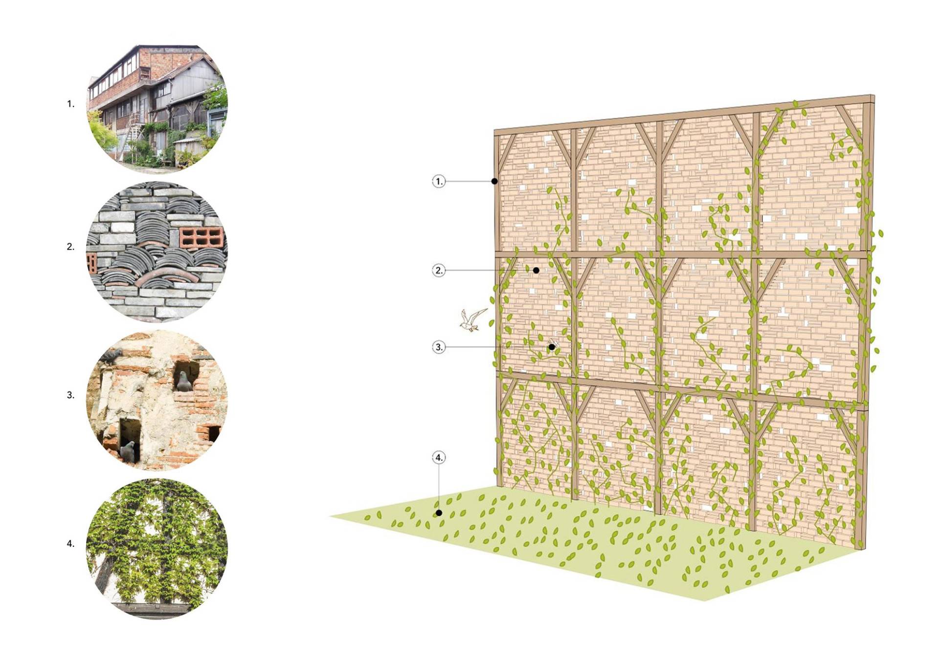 La matérialité présente sur site trouve une seconde vie dans sa réutilisation autour d'une œuvre artistique sur héberge favorisant la biodiversité du site et dans le réemploi des pavés au sol qui participent à prolonger la mémoire du lieu.
