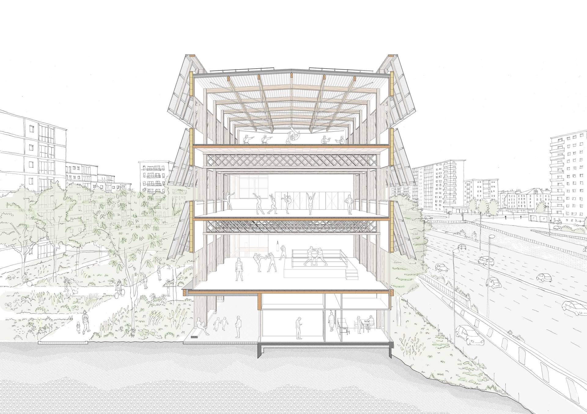 Equipement sportif à Porte de Vincennes Paris XIIe - Coupe-perspective transversale