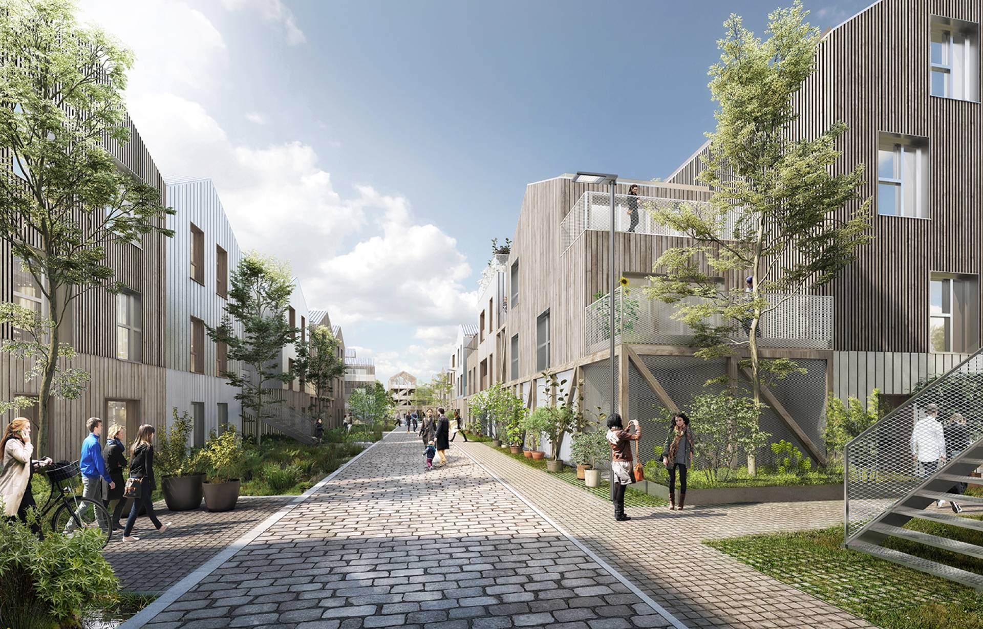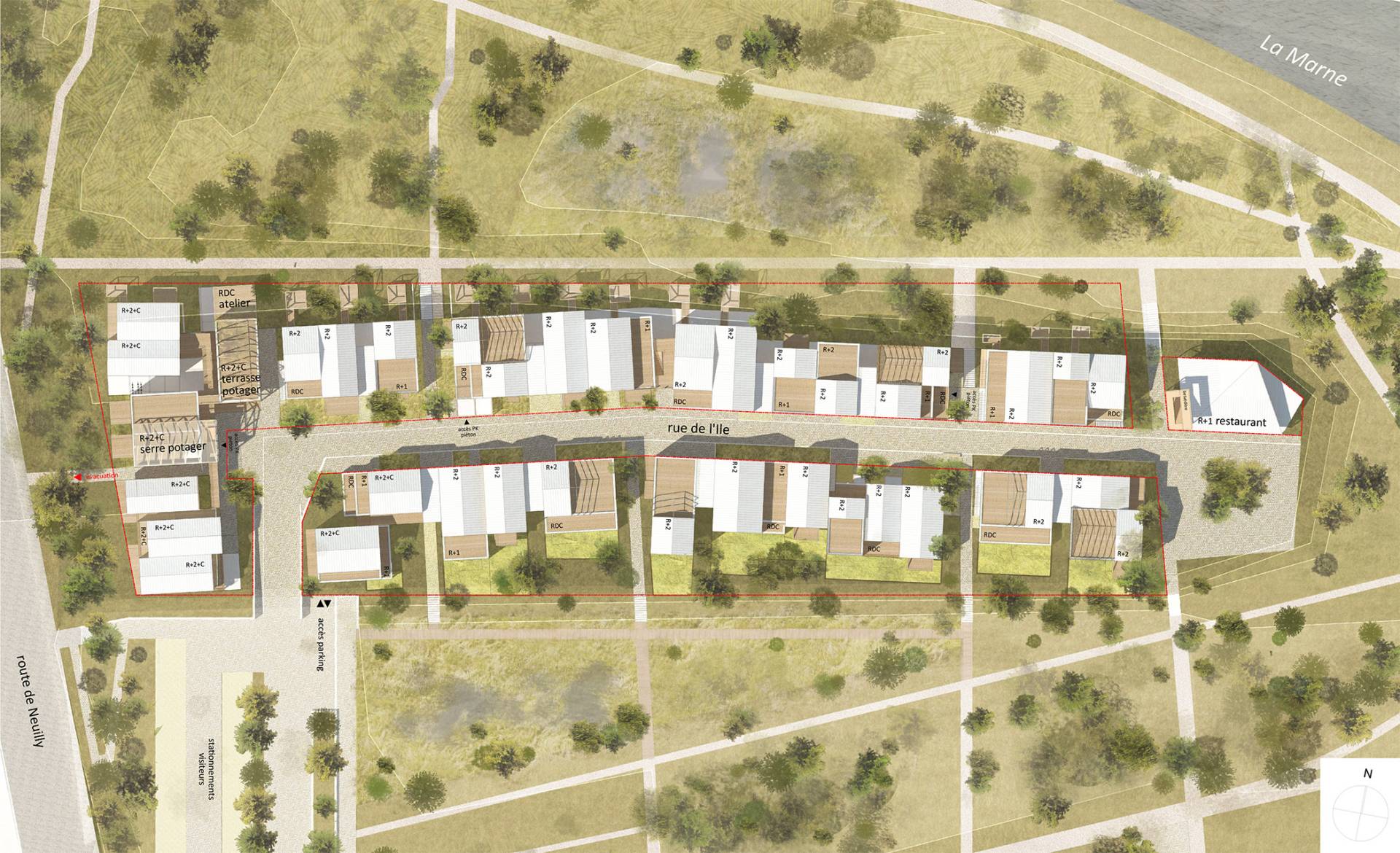 Ces imaginaires posent les jalons d’une architecture respectueuse. L’objectif est ici non pas de bâtir mais d’accompagner le paysage de la Marne. Il rythme l’impression d’ensemble et revêt ainsi une importance particulière : la vue sur la rivière et les perspectives sur le parc deviennent le caractère intrinsèque d’un lieu singulier. Il ne s’agit pas tant de recomposer un « continuum urbain » que d’identifier des modes de vivre ensemble et d’usages qui vont qualifier les modes d’habiter de cet écoquartier. L’appropriation et le partage des lieux se fait tant par une programmation équilibrée qui crée du lien que par une diversité d’habitat. Des façons d’habiter différenciées pour autant de contextes à portée de vue. Un lieu unique qui recrée le lien entre ville et paysage, où l’humeur de la Marne reste intacte. Un lieu unique pour prendre racine.